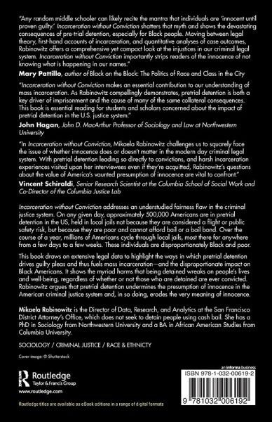 Incarceration Without Conviction addresses an understudied fairness flaw in the criminal justice system. On any given day, approximately 500,000 Americans are in pretrial detention in the US, held in local jails not because they are considered a flight or public safety risk, but because they are poor and cannot afford bail or a bail bond. Over the course of a year, millions of Americans cycle through local jails, most there for anywhere from a few days to a few weeks. These individuals are disproportionately Black and poor. This book draws on extensive legal data to highlight the ways in which pretrial detention drives guilty pleas and thus fuels mass incarceration--and the disproportionate impact on Black Americans. It shows the myriad harms that being detained wreaks on people's lives and well-being, regardless of whether or not those who are detained are ever convicted. Rabinowitz argues that pretrial detention undermines the presumption of innocence in the American criminal justice system and, in so doing, erodes the very meaning of innocence.