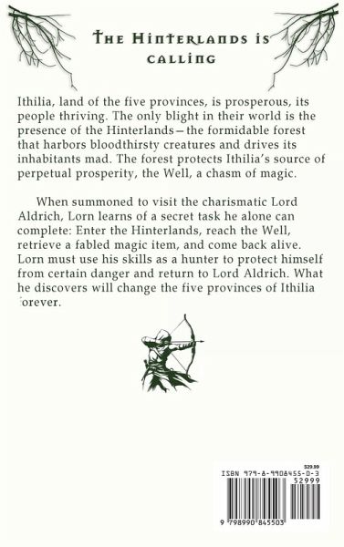 Ithilia, land of the five provinces, is prosperous, its people thriving. The only blight in their world is the presence of the Hinterlands-the formidable forest that harbors bloodthirsty creatures and drives its inhabitants mad. The forest protects Ithilia's source of perpetual prosperity, the Well, a chasm of magic. When summoned to visit the charismatic Lord Aldrich, Lorn learns of a secret task he alone can complete: Enter the Hinterlands, reach the Well, retrieve a fabled magic item, and come back alive. Lorn must use his skills as a hunter to protect himself from certain danger and return to Lord Aldrich. What he discovers will change the five provinces of Ithilia forever.