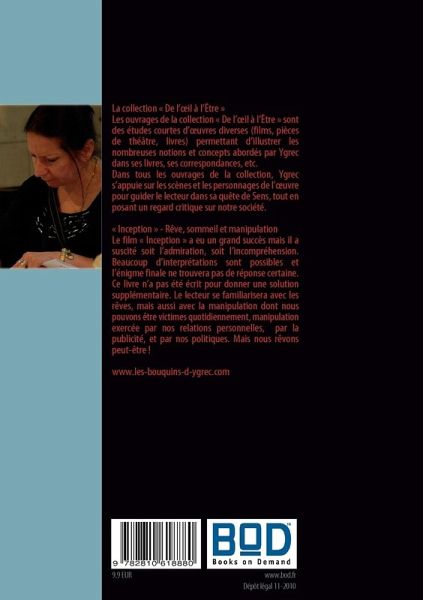 La collection « De l'oeil à l'Être »Les ouvrages de la collection « De l'oeil à l'Être » sont des outils de développement personnel. Ygrec s'appuie sur les scènes et les personnages du film pour guider le lecteur dans sa quête de Sens, tout en posant un regard critique sur notre société. En devenant un support pour notre apprentissage, l'oeuvre choisie nous aide à franchir les étapes de notre cheminement intérieur.« Inception » - Rêve, sommeil et manipulationLe film « Inception » a eu un grand succès.Il a pourtant suscité soit l'admiration, soit l'incompréhension. Beaucoup d'interprétations sont possibles et l'énigme finale ne trouvera pas de réponse certaine. Ce livre n'a pas été écrit pour donner une solution supplémentaire. Le lecteur se familiarisera ici avec les rêves, mais aussi avec la manipulation dont nous pouvons être victimes quotidiennement, manipulation exercée par nos relations personnelles, par la publicité, et par nos politiques. Mais nous rêvons peut-être !