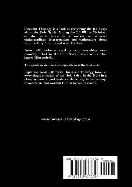 Incessant Theology is a look at everything the Bible says about the Holy Spirit. Among the 2.3 Billion Christians in the world there is a myriad of different understandings, interpretations and explanations about who the Holy Spirit is and what He does. Some will embrace anything and everything even remotely linked to the Holy Spirit, others will all but ignore Him entirely. The question is; which interpretation is the best one? Exploring some 300 verses, Incessant Theology looks at every single mention of the Holy Spirit in the Bible in a clear, systematic and understandable way in an attempt to appreciate and worship Him as Scripture reveals.