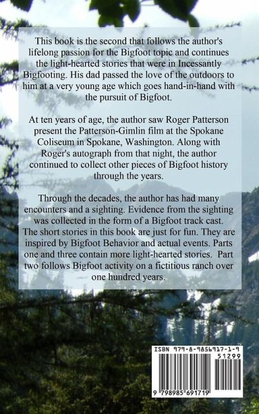 This book is the second that follows the author's lifelong passion for the Bigfoot topic and continues the light-hearted stories that were in Incessantly Bigfooting. His dad passed the love of the outdoors to him at a very young age which goes hand-in-hand with the pursuit of Bigfoot. At ten years of age, the author saw Roger Patterson present the Patterson-Gimlin film at the Spokane Coliseum in Spokane, Washington. Along with Roger's autograph from that night, the author continued to collect other pieces of bigfoot history through the years. Through the decades, the author has had many encounters and a sighting. Evidence from the sighting was collected in the form of a Bigfoot track cast. The short stories in this book are just for fun. They are inspired by Bigfoot Behavior and actual events. Part one and three contain more light-hearted stories. Part two follows Bigfoot activity on a fictitious ranch over one hundred years.