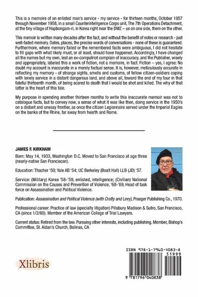 This is a memoire of an enlisted man's service - my service for thirteen months, October 1957 through November 1958, in a small Counterintelligence Corps unit, The 7th Operations Detachment, at the tiny village of Hapbongam-ri, in Korea right near the DMZ - us on one side, them on the other. This memoir is written many decades after the fact, and without the benefit of notes or research - just well faded memory. Dates, places, the precise words of conversations - none of these is guaranteed. Furthermore, where memory failed or the remembered facts were ambiguous, I did not hesitate to fill gaps with what likely must, or at least, should have happened. Accordingly, I have changed all the names but my own, lest an ex compatriot complain of inaccuracy, and the Publisher, wisely and appropriately, labeled this a work of fiction, not a memoire, in fact. Fiction - yes, I agree: No doubt my account is inaccurate in a merely factual sense. It is, however, meticulously accurate in reflecting my memory - of strange sights, smells and customs, of fellow citizen-soldiers coping with lonely service in a distant dangerous land, and above all, toward the end of my tour in that fateful thirteenth month, of being scared to death that I would be shot and killed. The why of that latter is the heart of this tale. My purpose in spending another thirteen months to write this inaccurate memoir was not to catalogue facts, but to convey now, a sense of what it was like then, doing service in the 1950's on a distant and uneasy frontier, as once the citizen Legionnaire served under the Imperial Eagles on the banks of the Rhine, far away from hearth and Rome.