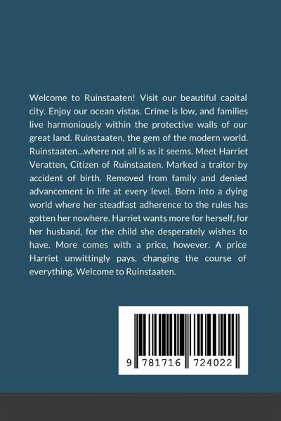 Welcome to Ruinstaaten! Visit our beautiful capital city. Enjoy our ocean vistas. Crime is low, and families live harmoniously within the protective walls of our great land. Ruinstaaten, the gem of the modern world. Ruinstaaten...where not all is as it seems. Meet Harriet Veratten, Citizen of Ruinstaaten. Marked a traitor by accident of birth. Removed from family and denied advancement in life at every level. Born into a dying world where her steadfast adherence to the rules has gotten her nowhere. Harriet wants more for herself, for her husband, for the child she desperately wishes to have. More comes with a price, however. A price Harriet unwittingly pays, changing the course of everything. Welcome to Ruinstaaten.