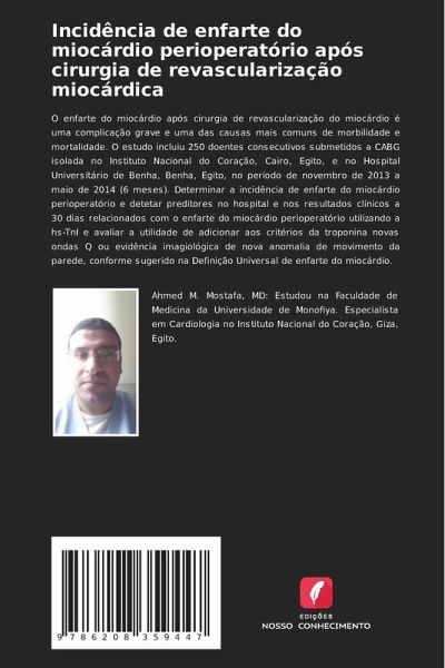 O enfarte do miocárdio após cirurgia de revascularização do miocárdio é uma complicação grave e uma das causas mais comuns de morbilidade e mortalidade. O estudo incluiu 250 doentes consecutivos submetidos a CABG isolada no Instituto Nacional do Coração, Cairo, Egito, e no Hospital Universitário de Benha, Benha, Egito, no período de novembro de 2013 a maio de 2014 (6 meses). Determinar a incidência de enfarte do miocárdio perioperatório e detetar preditores no hospital e nos resultados clínicos a 30 dias relacionados com o enfarte do miocárdio perioperatório utilizando a hs-TnI e avaliar a utilidade de adicionar aos critérios da troponina novas ondas Q ou evidência imagiológica de nova anomalia de movimento da parede, conforme sugerido na Definição Universal de enfarte do miocárdio.