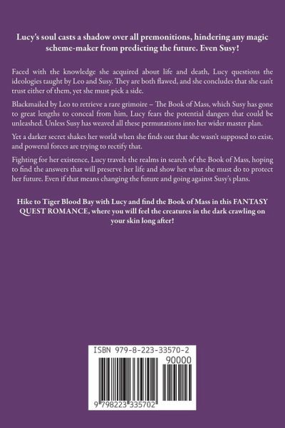 Lucy's soul casts a shadow over all premonitions, hindering any magic scheme-maker from predicting the future. Even Susy! Faced with the knowledge she acquired about life and death, Lucy questions the ideologies taught by Leo and Susy. They are both flawed, and she concludes that she can't trust either of them, yet she must pick a side. Blackmailed by Leo to retrieve a rare grimoire - The Book of Mass, which Susy has gone to great lengths to conceal from him, Lucy fears the potential dangers that could be unleashed. Unless Susy has weaved all these permutations into her wider master plan. Yet a darker secret shakes her world when she finds out that she wasn't supposed to exist, and powerul forces are trying to rectify that. Fighting for her existence, Lucy travels the realms in search of the Book of Mass, hoping to find the answers that will preserve her life and show her what she must do to protect her future. Even if that means changing the future and going against Susy's plans. Hike to Tiger Blood Bay with Lucy and find the Book of Mass in this FANTASY QUEST ROMANCE, where you will feel the creatures in the dark crawling on your skin long after!