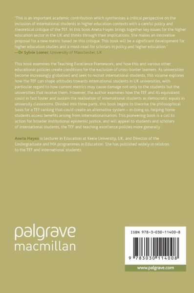 This book examines the Teaching Excellence Framework, and how this and various other educational policies create conditions for the exclusion of cross-border learners. As universities become increasingly globalised and seek to recruit international students, this volume explores how the TEF can shape attitudes towards international students in UK universities, with particular regard to how current metrics may cause damage not only to the students but the universities that receive them. However, the author examines how the TEF and its equivalent could in fact foster and sustain the realisation of international students as democratic equals in university classrooms. Divided into three parts, this book begins to theorise the philosophical basis for a TEF ranking that could create an alternative system - in doing so, helping home students access benefits arising from internationalisation. This pioneering book is a call to action for broader institutional epistemic justice, and will appealto students and scholars of international students, the TEF and teaching excellence policies more generally.