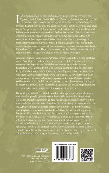 This book mainly explores the lived experiences of six women, including the author herself, with physical disabilities in China. The book provides in-depth descriptions of each woman's experiences in different aspects and analyze the commonalities and differences in their experiences through their life courses. The book explores answers to some of these questions: How do physically disabled women make sense of their experiences? What are some of the empowering and/or disempowering moments/events in their lives, if any? What are disabled women's experiences in terms of education, employment, relationships, family life, and social activism? How does some of the disabled women in the book become motivated and mobilized to work on disability issues? This book serves to amplify Chinese disabled women's stories and make their presence more visible. Too often, dominant narratives and depictions of disability are written by people without disabilities, while disabled people's voices are either invisible or secondary. Sadly, this phenomenon is not new and disability advocates have been faced with these types of narratives for quite some years. To have one's own voice and speak up is to claim subjectivity, agency, and power. Different stories told by women with disabilities themselves can enrich our understanding of disability and gender. These stories have the potential to challenge dominant and oppressive narratives prevalent in our ableist societies. The stories included in this book could provide space and potential to connect with disabled people (people with either visible or invisible disabilities) elsewhere. Women's empowering experiences and encounters shown in this book could inspire relevant stakeholders to think of ways to better understand and support disabled women in their environments. This book will have wide implications for readers not only in China, but also in other parts of the world. Many disability stories of exclusion and/or empowerment of the world are still hidden and not reflected upon. The author invites readers to reflect on their own experiences and how societies have impacted the life courses of individuals with or without disabilities in their respective social, political, economic, and cultural environments. Cultural and social change around disability can start with anyone who are touched by genuine stories of vulnerability and reflexivity, as the ones to be shared in this book.