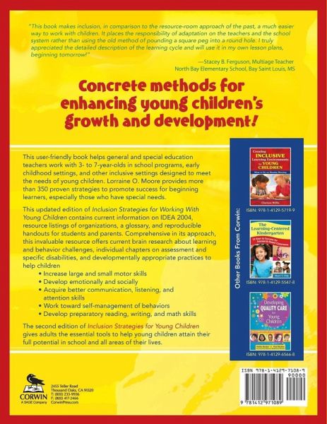 Concrete methods for enhancing young children's growth and development! This user-friendly book, written for educators who work with 3- to7-year-olds, provides more than 350 strategies to promote success for beginning learners, especially those with special needs. The second edition contains current brain research about learning and behavior challenges, updated information on IDEA 2004, a glossary, resource listings of organizations, and reproducibles. The author provides teachers with developmentally appropriate practices to help children: Increase motor skills Develop emotionally and socially Acquire better communication, listening, and attention skills Work toward self-management of behaviors Develop preparatory reading, writing, and math skills