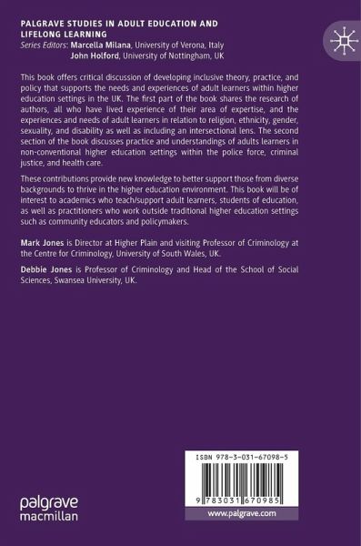 This book offers critical discussion of developing inclusive theory, practice, and policy that supports the needs and experiences of adult learners within higher education settings in the UK. The first part of the book shares the research of authors, all who have lived experience of their area of expertise, and the experiences and needs of adult learners in relation to religion, ethnicity, gender, sexuality, and disability as well as including an intersectional lens. The second section of the book discusses practice and understandings of adults learners in non-conventional higher education settings within the police service, criminal justice, and health care.