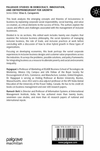 Part I: Inclusive Business Philosophy.- Chapter 1: Disruptive Management Practices: Surviving the Changing Business Ecosystem.- Chapter 2: Crowd-based Innovations as Disruptors: Breakthrough in the Corporate.- Chapter 3: Attributes of Collective Intelligence and Entrepreneurial Econoscape in Developing Economies.- Chapter 4: Hybridity in Business Practices in Developing Economies: Convergence of People, Society, and Information Technology.- Chapter 5: Inclusive Businesses in Asia and Global Effects.- Chapter 6: Inclusiveness and Corporate Alliances: Structural Changes in Sectoral Enterprises.- Part II: Governance and Social Dynamics.- Chapter 7: Corporate Social Responsibility and Inclusivity in Businesses: The Evolution of Green Innovations.- Chapter 8: Corporate Journey through People and Society: Analysis of Sociological perspectives.- Chapter 9: Measuring 'Contours and Furrows' of Trade Flow and Economic Recovery: A Saga of Socio-political Dynamics.- Chapter 10: Transformative Business Leadership in Crowd Empowerment for Collective Effects in Business.- Chapter 11: Role of Public Policies and Reverse Accountability in Managing Inclusive Businesses.- Part III: Trade and Economy.- Chapter 12: Social Governance and Cross-sectional Growth in Small and Medium Enterprises in Developing Economies.- Chapter 13: Local-Global Business and Economic Growth: Effects of Changing Markets.- Chapter 14: Internationalization and Cross-country Trade Management: Exploring Business Diversities across Industrial Sectors.- Part IV: Inclusivity in Management.- Chapter 15: Organizational Design Archetypes: Exploring the Best Fit for Inclusive Businesses in Emerging Markets.- Chapter 16: Convergence of Divergent Management Factors in Local Enterprises: Integrating Stakeholders and Leaders in Decision Making.- Chapter 17: Implementing Design Thinking in Small and Medium Enterprises: Developing Collective Intelligence as a Management Tool.- Chapter 18: The New Decision-mix to Reform Marketing Organizations: A Dynamic Outlook.- Chapter 19: Stakeholder Controlled Financial Management in Transitional Companies: Lessons from Inclusive Businesses in Developing Economies.- Chapter 20: Managing Human Capital in Organizations: Socio-cultural Dimensions in Creating Collective Workstations.- Part V: The Horizon.- Chapter 21: Epilogue: Driving Inclusive Businesses with Hybrid Growth in Developing Economies.