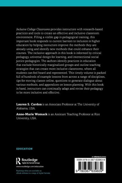 Inclusive College Classrooms provides instructors with research-based practices and tools to create an effective and inclusive classroom environment. Filling a visible gap in pedagogical training, this important book responds to current barriers to inclusion in higher education by helping instructors improve the methods they are already using and identify new methods that could enhance their courses. The inclusive approach in this book is informed by critical pedagogy, universal design for learning, and intersectional social justice pedagogies. The authors identify practices in education that exclude historically marginalized groups and outline teaching strategies that can create more inclusive classrooms, where all students can feel heard and represented. This timely volume is packed full of hundreds of example lessons from across a range of disciplines, tips for moving classes online, questions to generate dialogue about various methods, and appendices on lesson planning. With this book in hand, instructors can continually adapt and revise their pedagogy to be more inclusive and effective.