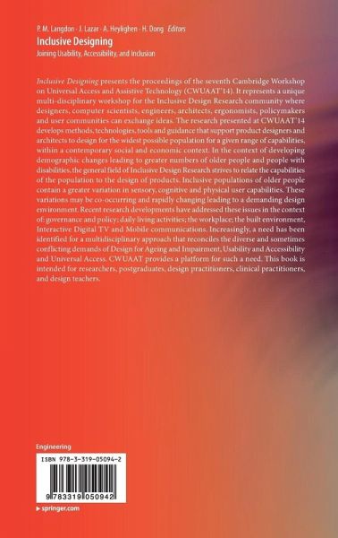 'Inclusive Designing' presents the proceedings of the seventh Cambridge Workshop on Universal Access and Assistive Technology (CWUAAT '14). It represents a unique multi-disciplinary workshop for the Inclusive Design Research community where designers, computer scientists, engineers, architects, ergonomists, policymakers and user communities can exchange ideas. The research presented at CWUAAT '14 develops methods, technologies, tools and guidance that support product designers and architects to design for the widest possible population for a given range of capabilities, within a contemporary social and economic context. In the context of developing demographic changes leading to greater numbers of older people and people with disabilities, the general field of Inclusive Design Research strives to relate the capabilities of the population to the design of products. Inclusive populations of older people contain a greater variation in sensory, cognitive and physical user capabilities. These variations may be co-occurring and rapidly changing leading to a demanding design environment. Recent research developments have addressed these issues in the context of: governance and policy; daily living activities; the workplace; the built environment, Interactive Digital TV and Mobile communications. Increasingly, a need has been identified for a multidisciplinary approach that reconciles the diverse and sometimes conflicting demands of Design for Ageing and Impairment, Usability and Accessibility and Universal Access. CWUAAT provides a platform for such a need. This book is intended for researchers, postgraduates, design practitioners, clinical practitioners, and design teachers.