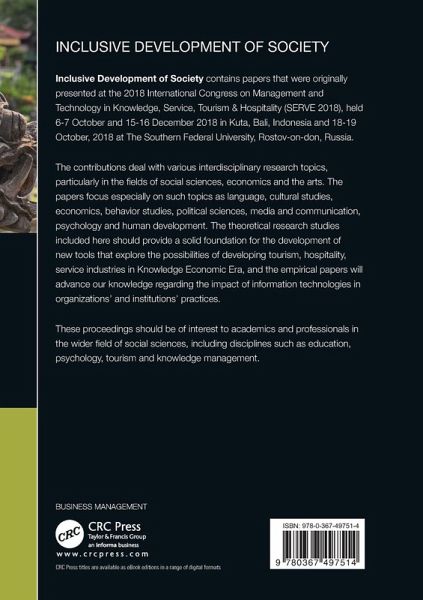 Inclusive Development of Society contains papers that were originally presented at the 2018 International Congress on Management and Technology in Knowledge, Service, Tourism & Hospitality (SERVE 2018), held 6-7 October and 15-16 December 2018 in Kuta, Bali, Indonesia and 18-19 October, 2018 at The Southern Federal University, Rostov-on-don, Russia. The contributions deal with various interdisciplinary research topics, particularly in the fields of social sciences, economics and the arts. The papers focus especially on such topics as language, cultural studies, economics, behavior studies, political sciences, media and communication, psychology and human development. The theoretical research studies included here should provide a solid foundation for the development of new tools that explore the possibilities of developing tourism, hospitality, service industries in Knowledge Economic Era, and the empirical papers will advance our knowledge regarding the impact of information technologies in organizations' and institutions' practices. These proceedings should be of interest to academics and professionals in the wider field of social sciences, including disciplines such as education, psychology, tourism and knowledge management.