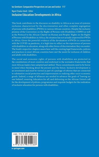 This book contributes to the discourse on disability in Africa as an issue of systemic exclusion characterized by the discrimination and often complete segregation of persons with disabilities (PWDs) in various African countries. Despite the inclusive promise of the Convention on the Rights of Persons with Disabilities (CRPD) as well as the Protocol to the African Charter on Human and Peoples' Rights on the Rights of Persons with Disabilities in Africa, the situation has not actually improved for PWDs in Africa. Given the powerful evidence of the devaluation of PWDs in connection with the COVID-19 pandemic, it is high time to reflect on the experiences of persons with disabilities in education, along with other forms of discrimination they encounter. The book's respective chapters assess how well the existing legal frameworks, policies and practices in most African countries have met the needs for inclusion of children and adults with disabilities.