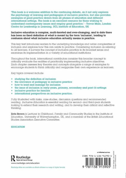 Inclusive education is complex, multi-faceted and ever-changing and to date there has been no fixed definition of what is meant by the term 'inclusion', leading to confusion about what inclusive education actually means in practice.¿ This key text introduces readers to the underlying knowledge and wider complexities of inclusion and explores how this can relate to practice. Considering inclusion as referring to all learners, it surveys the concept of inclusive practice in its broadest sense and examines its implementation in a variety of educational institutions. Throughout the book, international contributors consider this broader concept to critically evaluate the realities of practically implementing inclusive objectives. Each chapter assesses key theories and concepts alongside a range of examples to encourage students to think critically and reappraise their own experience as learners. Key topics covered include: ¿ studying the definition of inclusion ¿ the relevance of pedagogy in inclusive practice ¿ how to lead and manage¿for inclusion ¿ the issue of inclusion in early years, primary, secondary and post-16 settings ¿ inclusive practice for families ¿ international perspectives on inclusive practice. Fully illustrated with tasks, case studies, discussion questions and recommended reading, Inclusive Education is essential reading for second and third year students looking to extend their research and writing, and to develop their critical and reflective thinking.