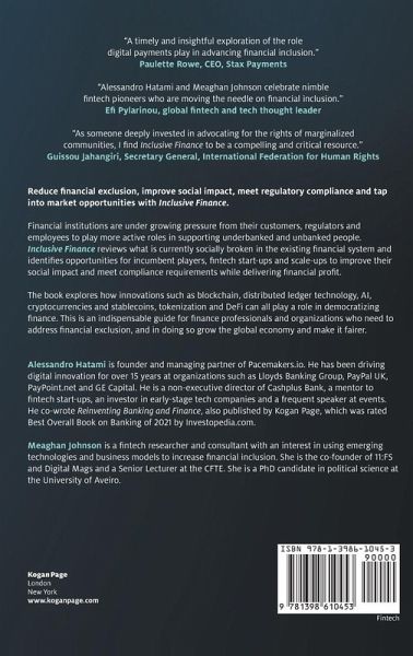 Reduce financial exclusion, improve social impact, meet regulatory compliance and tap into market opportunities with Inclusive Finance. Financial institutions are under growing pressure from their customers, regulators and employees to play more active roles in supporting underbanked and unbanked individuals. Inclusive Finance reviews what is currently socially broken in the existing financial system and identifies opportunities for how incumbent players, fintech start-ups and scale ups can improve their social impact and meet compliance requirements while delivering financial profit. Inclusive Finance explores how innovations such as blockchain, distributed ledger technology, AI, cryptocurrencies and stablecoins, tokenization and DeFi can all play a role in democratizing finance. Written by two esteemed finance experts that are driving digital innovation, this is an indispensable guide for finance professionals and organizations who need to address financial exclusion, making the global economy larger and fairer.