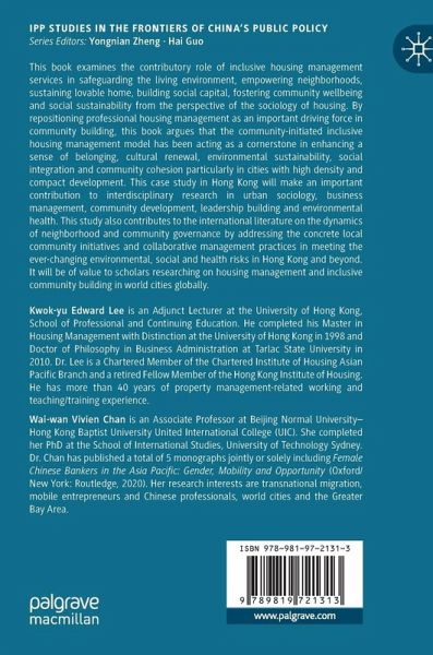 This book examines the contributory role of inclusive housing management services in safeguarding the living environment, empowering neighborhoods, sustaining lovable home, building social capital, fostering community wellbeing and social sustainability from the perspective of the sociology of housing. By repositioning professional housing management as an important driving force in community building, this book argues that the community-initiated inclusive housing management model has been acting as a cornerstone in enhancing a sense of belonging, cultural renewal, environmental sustainability, social integration and community cohesion particularly in cities with high density and compact development. This case study in Hong Kong will make an important contribution to interdisciplinary research in urban sociology, business management, community development, leadership building and environmental health. This study also contributes to the international literature on the dynamics of neighborhood and community governance by addressing the concrete local community initiatives and collaborative management practices in meeting the ever-changing environmental, social and health risks in Hong Kong and beyond. It will be of value to scholars researching on housing management and inclusive community building in world cities globally.