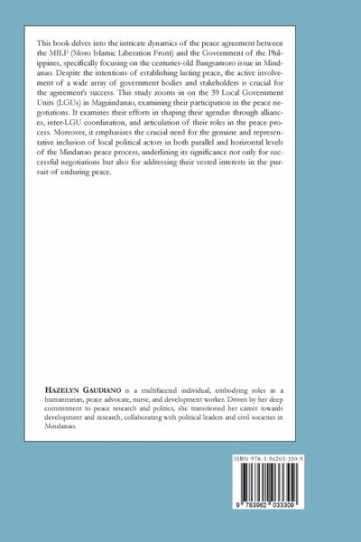 This book delves into the intricate dynamics of peace agreement between the MILF (Moro Islamic Liberation Fron) and the Government of the Philippines, specifically focusing on the centuries-old Bangsamoro issue in Mindanao. Despte the intentions of establishing lasting peace, the active involvement of a wide array of government bodies and stakeholders is crucial for the agreement's success.This study zooms in on the 39 Local Government Units (LGUs) in Maguindanao, examining their participation in the peace negotiations.It examines their efforts in shaping their agendas through alliances, inter-LGU coordination, and articulation of their roles in the peace process.Moreover, it emphasizes the crucial need for the genuine and representative inclusion of local political actors in both parallel and gorizontal levels of the Mindanao peace process, underlining its significance not only for successful negotiations but also for addressing their vested interests in the pursuit of enduring peace.