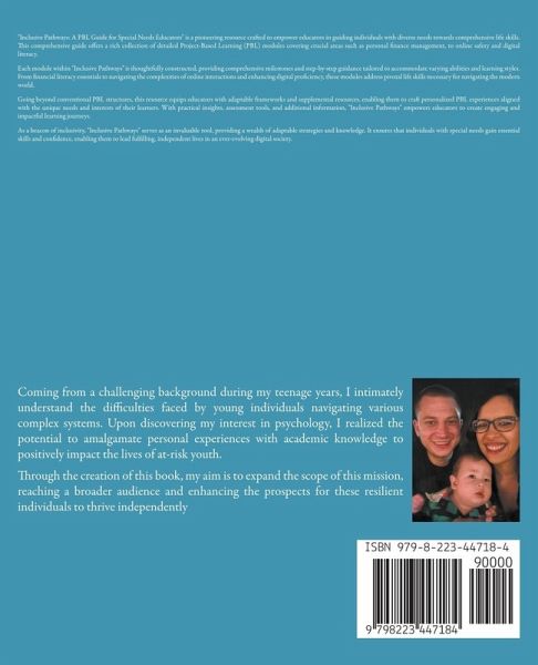 "Inclusive Pathways: A PBL Guide for Special Needs Educators" is a pioneering resource crafted to empower educators in guiding individuals with diverse needs towards comprehensive life skills. This comprehensive guide offers a rich collection of detailed Project-Based Learning (PBL) modules covering crucial areas such as personal finance management, to online safety and digital literacy. Each module within "Inclusive Pathways" is thoughtfully constructed, providing comprehensive milestones and step-by-step guidance tailored to accommodate varying abilities and learning styles. From financial literacy essentials to navigating the complexities of online interactions and enhancing digital proficiency, these modules address pivotal life skills necessary for navigating the modern world. Going beyond conventional PBL structures, this resource equips educators with adaptable frameworks and supplemental resources, enabling them to craft personalized PBL experiences aligned with the unique needs and interests of their learners. With practical insights, assessment tools, and additional information, "Inclusive Pathways" empowers educators to create engaging and impactful learning journeys. As a beacon of inclusivity, "Inclusive Pathways" serves as an invaluable tool, providing a wealth of adaptable strategies and knowledge. It ensures that individuals with special needs gain essential skills and confidence, enabling them to lead fulfilling, independent lives in an ever-evolving digital society.