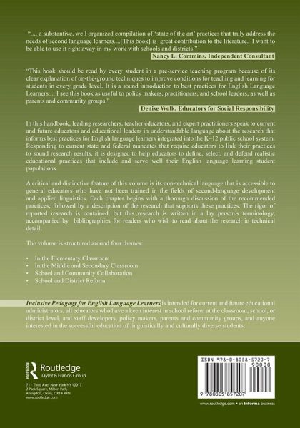 In this Handbook leading researchers, teacher educators, and expert practitioners speak to current and future educators and educational leaders in understandable language about the research that informs best practices for English language learners integrated into the K-12 public school system.