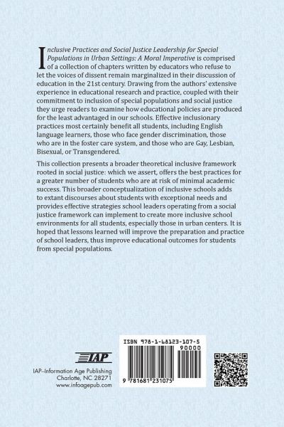 A volume in Educational Leadership for Social Justice Series Editor Jeffrey S. Brooks, Monash University, Denise E. Armstrong, Brock University; Ira Bogotch, Florida Atlantic University; Sandra Harris, Lamar University; Whitney H. Sherman, Virginia Commonwealth University; George Theoharis, Syracuse University Inclusive Practices and Social Justice Leadership for Special Populations in Urban Settings: A Moral Imperative is comprised of a collection of chapters written by educators who refuse to let the voices of dissent remain marginalized in our discussion of education in the 21st century education. Drawing from the authors' extensive experience in educational research and practice, coupled with their commitment to inclusion of special populations and social justice they urge readers to examine how educational policies are produced for the least advantaged in our schools. Effective inclusionary practices most certainly benefit all students, including English language learners, those who face gender discrimination, those who are in the foster care system, and those who are Gay, Lesbian, Bisexual, or Transgendered. This collection presents a broader theoretical inclusive framework rooted in social justice: which we assert, offers the best practices for a greater number of students who are at risk of minimal academic success. This broader conceptualization of inclusive schools adds to extant discourses about students with exceptional needs and provides effective strategies school leaders operating from a social justice framework can implement to create more inclusive school environments for all students, especially those in urban centers. It is hoped that lessons learned will improve the preparation and practice of school leaders, thus improve educational outcomes for students from special populations.