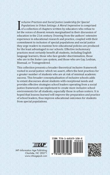 A volume in Educational Leadership for Social Justice Series Editor Jeffrey S. Brooks, Monash University, Denise E. Armstrong, Brock University; Ira Bogotch, Florida Atlantic University; Sandra Harris, Lamar University; Whitney H. Sherman, Virginia Commonwealth University; George Theoharis, Syracuse University Inclusive Practices and Social Justice Leadership for Special Populations in Urban Settings: A Moral Imperative is comprised of a collection of chapters written by educators who refuse to let the voices of dissent remain marginalized in our discussion of education in the 21st century education. Drawing from the authors' extensive experience in educational research and practice, coupled with their commitment to inclusion of special populations and social justice they urge readers to examine how educational policies are produced for the least advantaged in our schools. Effective inclusionary practices most certainly benefit all students, including English language learners, those who face gender discrimination, those who are in the foster care system, and those who are Gay, Lesbian, Bisexual, or Transgendered. This collection presents a broader theoretical inclusive framework rooted in social justice: which we assert, offers the best practices for a greater number of students who are at risk of minimal academic success. This broader conceptualization of inclusive schools adds to extant discourses about students with exceptional needs and provides effective strategies school leaders operating from a social justice framework can implement to create more inclusive school environments for all students, especially those in urban centers. It is hoped that lessons learned will improve the preparation and practice of school leaders, thus improve educational outcomes for students from special populations.