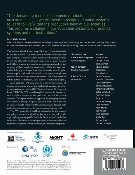 Economic production indicators such as gross domestic product (GDP) and the Human Development Index (HDI) fail to reflect the state of natural resources or ecological conditions and both focus exclusively on the short term. The Inclusive Wealth Report 2014 is the second book in an important biennial series that provides a new framework for measuring the inclusive wealth of nations. It provides an overview of how the capital asset components of inclusive wealth evolved between 1990 and 2010, and analyses the meaning of these trends for sustainability. While the asset base studied is largely unchanged from the 2012 report, the country sample has been expanded from 20 to 140 nations and the focus has shifted from natural to human capital. This report offers a wealth of information for researchers and policy-makers, identifying key gaps in data and knowledge, and suggesting specific needs for future research.