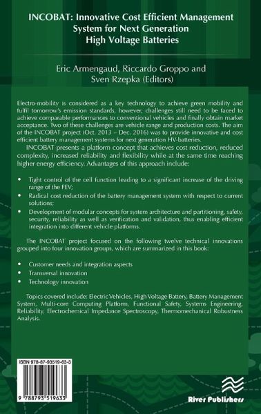 Electro-mobility is considered as a key technology to achieve green mobility and fulfil tomorrow's emission standards. However, different challenges still need to be faced to achieve comparable performances to conventional vehicles and finally obtain market acceptance. Two of these challenges are vehicle range and production costs. In that context, the aim of the INCOBAT project (October 2013 - December 2016) was to provide innovative and cost efficient battery management systems for next generation HV-batteries. INCOBAT presents a platform concept that achieves cost reduction, reduced complexity, increased reliability and flexibility while at the same time reaching higher energy efficiency. Advantages of this approach include: Tight control of the cell function leading to a significant increase of the driving range of the FEV; Radical cost reduction of the battery management system with respect to current solutions; Development of modular concepts for system architecture and partitioning, safety, security, reliability as well as verification and validation, thus enabling efficient integration into different vehicle platforms. The INCOBAT project focused on the following twelve technical innovations grouped into four innovation groups, which are summarized in this book: Customer needs and integration aspects Transversal innovation Technology innovation