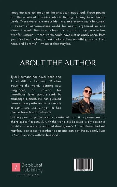Incognito is a collection of the unspoken made real. These poems are the words of a seeker who is finding his way in a chaotic world. These words are about life, love, and everything in between. If stream-of-consciousness could be neatly organized in one place, it would find its way here. It's an ode to anyone who has ever felt unseen - these words could have just as easily come from you. It's about making a mark and creating something to say "I am here, and I am me" - whoever that may be.