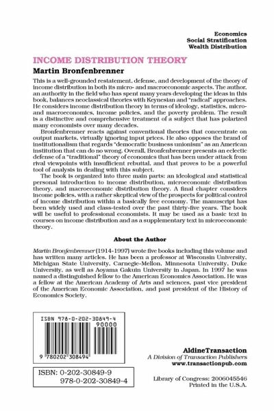 This is a well-grounded restatement, defense, and development of the theory of income distribution in both its micro- and macroeconomic aspects. The author, an authority in the field who has spent many years developing the ideas in this book, balances neoclassical theories with Keynesian and "radical" approaches. He considers income distribution theory in terms of ideology, statistics, micro- and macroeconomics, income policies, and the poverty problem. The result is a distinctive and comprehensive treatment of a subject that has polarized many economists over many decades. Bronfenbrenner reacts against conventional theories that concentrate on output markets, virtually ignoring input prices. He also opposes the brand of institutionalism that regards "democratic business unionism" as an American institution that can do no wrong. Overall, Bronfenbrenner presents an eclectic defense of a "traditional" theory of economics that has been under attack from rival viewpoints with insufficient rebuttal, and that proves to be a powerful tool of analysis in dealing with this subject. The book is organized into three main parts: an ideological and statistical personal introduction to income distribution, microeconomic distribution theory, and macroeconomic distribution theory. A final chapter considers incomes policies, with a rather skeptical view of the prospects for political control of income distribution within a basically free economy. The manuscript has been widely used and class tested over the past thirty-five years. The book will be useful to professional economists. It may be used as a basic text in courses on income distribution and as a supplementary text in microeconomic theory.