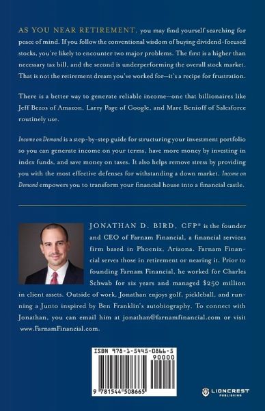 As you near retirement, you may find yourself searching for peace of mind. If you follow the conventional wisdom of buying dividend-focused stocks, you're likely to encounter two major problems. The first is a higher than necessary tax bill, and the second is underperforming the overall stock market. That is not the retirement dream you've worked for-it's a recipe for frustration. There is a better way to generate reliable income-one that billionaires like Jeff Bezos of Amazon, Larry Page of Google, and Marc Benioff of Salesforce routinely use. Income on Demand is a step-by-step guide for structuring your investment portfolio so you can generate income on your terms, have more money by investing in index funds, and save money on taxes. It also helps remove stress by providing you with the most effective defenses for withstanding a down market. Income on Demand empowers you to transform your financial house into a financial castle.