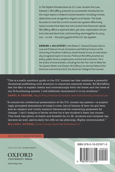 In The Oxford Introductions to U.S. Law: Income Tax Law, Edward McCaffery presents an accessible introduction to the major topics in the field of federal income taxation, such as income, deductions, and recognition of gains and losses. After discussing central rules and doctrines individually, Edward McCaffery offers a very sophisticated yet clear explanation of the interplay among them, carefully describing how they work together to carry out the policy goals of the U.S. tax system. Professor McCaffery describes, for example, how the current income tax in the United States has increasingly become a wage tax that favors those with capital rather than those whose money comes from labor. In explaining the consequences of tax policy on individuals, he also considers important possible alternatives for income taxation in the U.S. The Oxford Introductions to U.S. Law: Income Tax Law sets forth the 'who,' 'what,' 'when,' and 'why' of income tax law and describes the essential concepts of the field in a clear and concise manner that helps students and non-experts increase their understanding of the policies behind modern tax law and the ways in which these policies affect different types of individuals.
