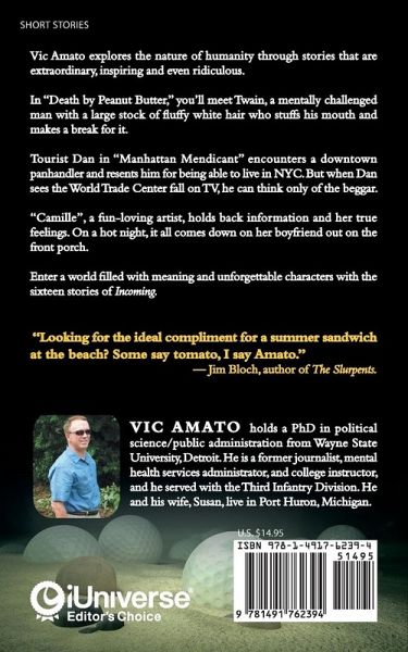 Vic Amato explores the nature of humanity through stories that are extraordinary, inspiring and even ridiculous. In "Death by Peanut Butter," you'll meet Twain, a mentally challenged man with a large stock of fluffy white hair who stuffs his mouth and makes a break for it. Tourist Dan in "Manhattan Mendicant" encounters a downtown panhandler and resents him for being able to live in NYC. But when Dan sees the World Trade Center fall on TV, he can think only of the beggar. "Camille", a fun-loving artist, holds back information and her true feelings. On a hot night, it all comes down on her boyfriend out on the front porch. Enter a world filled with meaning and unforgettable characters with the sixteen stories of Incoming. "Looking for the ideal compliment for a summer sandwich at the beach? Some say tomato, I say Amato." - Jim Bloch, author of The Slurpents.