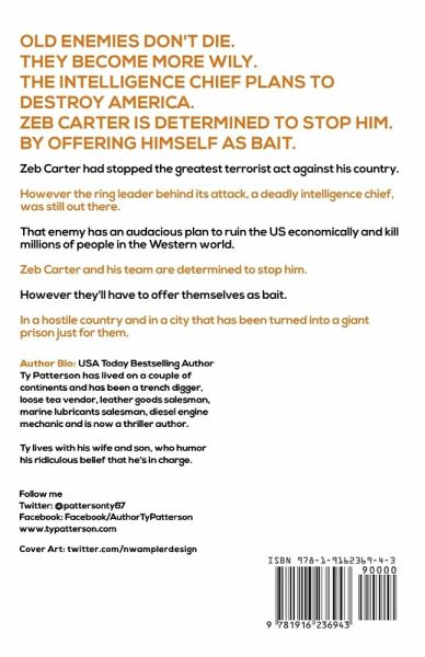 Old enemies don't die. They become more wily. The intelligence chief plans to kill millions and change the world order. Zeb Carter is determined to stop him. By offering himself as bait. Zeb Carter had stopped the greatest terrorist act against his country. However the ring leader behind its attack, a deadly intelligence chief, was still out there. That enemy has an audacious plan to ruin the US economically and kill millions of people in the Western world. Zeb Carter and his team are determined to stop him. However they'll have to offer themselves as bait. In a hostile country and in a city that has been turned into a giant prison just for them. ¿¿¿¿¿ 'An OMG, Freaking-Fantastic, Unputdownable, Unmissable, Unforgettable, Running-Out-Of-Superlatives, One-Click Thriller' ¿¿¿¿¿ 'Hands down, the best thriller of the year' ¿¿¿¿¿'Dazzling! Ty Patterson gets better with each thriller he writes' ¿¿¿¿¿'A stop-the-clock, call-in-sick thriller reminiscent of the best of Gregg Hurwitz, Vince Flynn and Brad Thor'