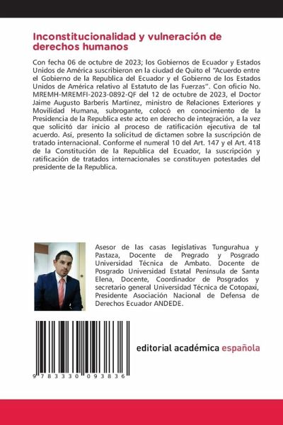 Con fecha 06 de octubre de 2023; los Gobiernos de Ecuador y Estados Unidos de América suscribieron en la ciudad de Quito el ¿Acuerdo entre el Gobierno de la Republica del Ecuador y el Gobierno de los Estados Unidos de América relativo al Estatuto de las Fuerzas¿. Con oficio No. MREMH-MREMFI-2023-0892-QF del 12 de octubre de 2023, el Doctor Jaime Augusto Barberis Martínez, ministro de Relaciones Exteriores y Movilidad Humana, subrogante, colocó en conocimiento de la Presidencia de la Republica este acto en derecho de integración, a la vez que solicitó dar inicio al proceso de ratificación ejecutiva de tal acuerdo. Así, presento la solicitud de dictamen sobre la suscripción de tratado internacional. Conforme el numeral 10 del Art. 147 y el Art. 418 de la Constitución de la Republica del Ecuador, la suscripción y ratificación de tratados internacionales se constituyen potestades del presidente de la Republica.