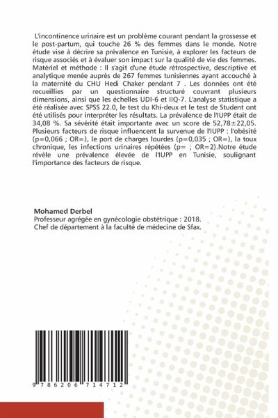 L'incontinence urinaire est un problème courant pendant la grossesse et le post-partum, qui touche 26 % des femmes dans le monde. Notre étude vise à décrire sa prévalence en Tunisie, à explorer les facteurs de risque associés et à évaluer son impact sur la qualité de vie des femmes. Matériel et méthode : Il s'agit d'une étude rétrospective, descriptive et analytique menée auprès de 267 femmes tunisiennes ayant accouché à la maternité du CHU Hedi Chaker pendant 7 . Les données ont été recueillies par un questionnaire structuré couvrant plusieurs dimensions, ainsi que les échelles UDI-6 et IIQ-7. L'analyse statistique a été réalisée avec SPSS 22.0, le test du Khi-deux et le test de Student ont été utilisés pour interpréter les résultats. La prévalence de l'IUPP était de 34,08 %. Sa sévérité était importante avec un score de 52,78±22,05. Plusieurs facteurs de risque influencent la survenue de l'IUPP : l'obésité (p=0,066 ; OR=), le port de charges lourdes (p=0,035 ; OR=), la toux chronique, les infections urinaires répétées (p= ; OR=2).Notre étude révèle une prévalence élevée de l'IUPP en Tunisie, soulignant l'importance des facteurs de risque.