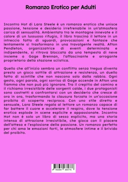 Incontro Hot di Lara Steele è un romanzo erotico che unisce passione, tensione e desiderio irrefrenabile in un'atmosfera carica di sensualità. Ambientato tra le montagne innevate e il calore di un lussuoso rifugio, il libro trascina il lettore in un intreccio fatto di sguardi, provocazioni e fantasie che lentamente si trasformano in una travolgente realtà. Afton Pendleton, organizzatrice di eventi determinata e indipendente, si ritrova bloccata da una tempesta di neve insieme a Gage Brennan, l'affascinante e arrogante proprietario della stazione sciistica.Quello che all'inizio sembra un conflitto senza tregua diventa presto un gioco sottile di attrazione e resistenza, un duello fatto di scintille che non nascono solo dalla rabbia. Ogni gesto, ogni parola, ogni sorriso di Gage accende in Afton una fiamma che non può più ignorare. Tra il crepitio del camino e il richiamo irresistibile delle sorgenti calde, i due protagonisti sono costretti a confrontarsi con un desiderio che crescedi ora in ora, trasformando la clausura forzata in un'occasione proibita di scoperta reciproca. Con uno stile diretto e sensuale, Lara Steele regala al lettore un romanzo capace di far battere il cuore e accelerare il respiro, dove la tensione erotica esplode in scene esplicite e appassionate. Incontro Hot non è solo un libro di sesso esplicito, ma una storia intensa di attrazione irresistibile, che gioca con il piacere dell'attesa e l'esplosione della passione. Un romanzo perfetto per chi ama le emozioni forti, le atmosfere intime e il brivido del proibito.