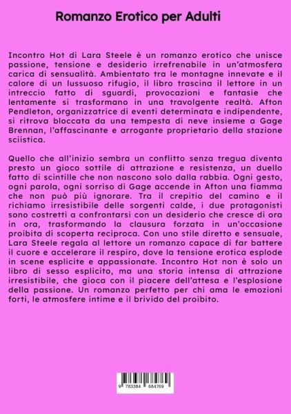 Incontro Hot di Lara Steele è un romanzo erotico che unisce passione, tensione e desiderio irrefrenabile in un'atmosfera carica di sensualità. Ambientato tra le montagne innevate e il calore di un lussuoso rifugio, il libro trascina il lettore in un intreccio fatto di sguardi, provocazioni e fantasie che lentamente si trasformano in una travolgente realtà. Afton Pendleton, organizzatrice di eventi determinata e indipendente, si ritrova bloccata da una tempesta di neve insieme a Gage Brennan, l'affascinante e arrogante proprietario della stazione sciistica.Quello che all'inizio sembra un conflitto senza tregua diventa presto un gioco sottile di attrazione e resistenza, un duello fatto di scintille che non nascono solo dalla rabbia. Ogni gesto, ogni parola, ogni sorriso di Gage accende in Afton una fiamma che non può più ignorare. Tra il crepitio del camino e il richiamo irresistibile delle sorgenti calde, i due protagonisti sono costretti a confrontarsi con un desiderio che crescedi ora in ora, trasformando la clausura forzata in un'occasione proibita di scoperta reciproca. Con uno stile diretto e sensuale, Lara Steele regala al lettore un romanzo capace di far battere il cuore e accelerare il respiro, dove la tensione erotica esplode in scene esplicite e appassionate. Incontro Hot non è solo un libro di sesso esplicito, ma una storia intensa di attrazione irresistibile, che gioca con il piacere dell'attesa e l'esplosione della passione. Un romanzo perfetto per chi ama le emozioni forti, le atmosfere intime e il brivido del proibito.