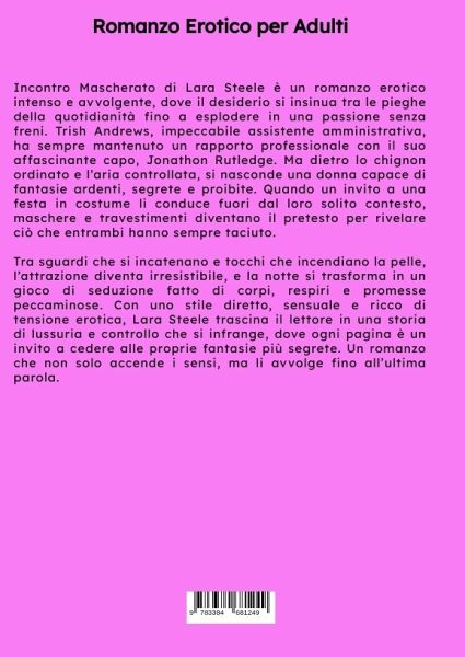 Incontro Mascherato di Lara Steele è un romanzo erotico intenso e avvolgente, dove il desiderio si insinua tra le pieghe della quotidianità fino a esplodere in una passione senza freni. Trish Andrews, impeccabile assistente amministrativa, ha sempre mantenuto un rapporto professionale con il suo affascinante capo, Jonathon Rutledge. Ma dietro lo chignon ordinato e l'aria controllata, si nasconde una donna capace di fantasie ardenti, segrete e proibite. Quando un invito a una festa in costume li conduce fuori dal loro solito contesto, maschere e travestimenti diventano il pretesto per rivelare ciò che entrambi hanno sempre taciuto. Tra sguardi che si incatenano e tocchi che incendiano la pelle, l'attrazione diventa irresistibile, e la notte si trasforma in un gioco di seduzione fatto di corpi, respiri e promesse peccaminose. Con uno stile diretto, sensuale e ricco di tensione erotica, Lara Steele trascina il lettore in una storia di lussuria e controllo che si infrange, dove ogni pagina è un invito a cedere alle proprie fantasie più segrete. Un romanzo che non solo accende i sensi, ma li avvolge fino all'ultima parola.