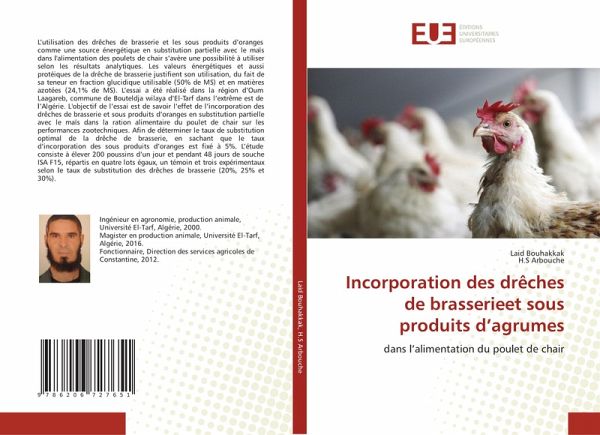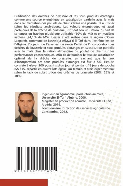 L'utilisation des drêches de brasserie et les sous produits d'oranges comme une source énergétique en substitution partielle avec le maïs dans l'alimentation des poulets de chair s'avère une possibilité à utiliser selon les résultats analytiques. Les valeurs énergétiques et aussi protéiques de la drêche de brasserie justifient son utilisation, du fait de sa teneur en fraction glucidique utilisable (50% de MS) et en matières azotées (24,1% de MS). L'essai a été réalisé dans la région d'Oum Laagareb, commune de Bouteldja wilaya d'El-Tarf dans l'extrême est de l'Algérie. L'objectif de l'essai est de savoir l'effet de l'incorporation des drêches de brasserie et sous produits d'oranges en substitution partielle avec le maïs dans la ration alimentaire du poulet de chair sur les performances zootechniques. Afin de déterminer le taux de substitution optimal de la drêche de brasserie, en sachant que le taux d'incorporation des sous produits d'oranges est fixé à 5%. L'étude consiste à élever 200 poussins d'un jour et pendant 48 jours de souche ISA F15, répartis en quatre lots égaux, un témoin et trois expérimentaux selon le taux de substitution des drêches de brasserie (20%, 25% et 30%).