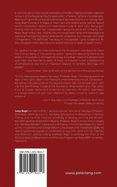 "Incorporation of the Bill of Rights is the essential guide to which federal protections the U.S. Supreme Court has extended to the state level. Professor Gary Bugh provides an invaluable service with his detailed content analysis of justices' written opinions. The multiple essays of the book, each one covering a single right, offer a unique approach to understanding the topic, including the relationships between justices' theoretical defenses and incorporation rulings. Teachers, students, and legal professionals will find the book a reliable source about incorporation for years to come."-Donald Gooch, Associate Professor of Political Science at Stephen F. Austin State University