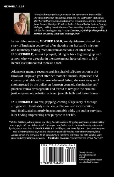 In her debut memoir, MOTHER LOAD, Wendy Adamson shared her story of landing in county jail after shooting her husband's mistress and ultimately finding freedom from addiction. Her latest book, INCORRIGIBLE, acts as a prequel, taking us back to growing up with a mom who was a regular in the state mental hospital, only to find herself institutionalized there as a teen. Adamson's memoir recounts a girl's spiral of self-destruction in the throes of unspoken grief after her mother's suicide. Depressed and constantly at odds with an overwhelmed father, she runs away until she's arrested by the police. At fourteen years old she finds herself plucked from a privileged life and forced to navigate the criminal justice system of probation officers, juvenile halls and foster homes. Incorrigible is a raw, gripping, coming-of-age story of teenage struggle with familial dysfunction, addiction, and incarceration, until finally, against nearly insurmountable odds, the author survives, later finding empowering new purpose in her life.