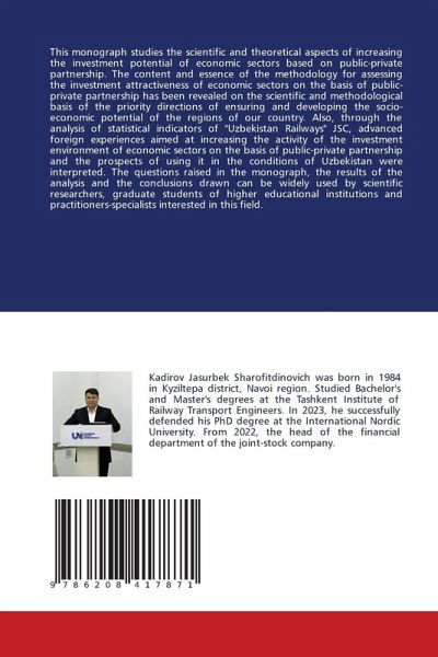 This monograph studies the scientific and theoretical aspects of increasing the investment potential of economic sectors based on public-private partnership. The content and essence of the methodology for assessing the investment attractiveness of economic sectors on the basis of public-private partnership has been revealed on the scientific and methodological basis of the priority directions of ensuring and developing the socio-economic potential of the regions of our country. Also, through the analysis of statistical indicators of "Uzbekistan Railways" JSC, advanced foreign experiences aimed at increasing the activity of the investment environment of economic sectors on the basis of public-private partnership and the prospects of using it in the conditions of Uzbekistan were interpreted. The questions raised in the monograph, the results of the analysis and the conclusions drawn can be widely used by scientific researchers, graduate students of higher educational institutions and practitioners-specialists interested in this field.