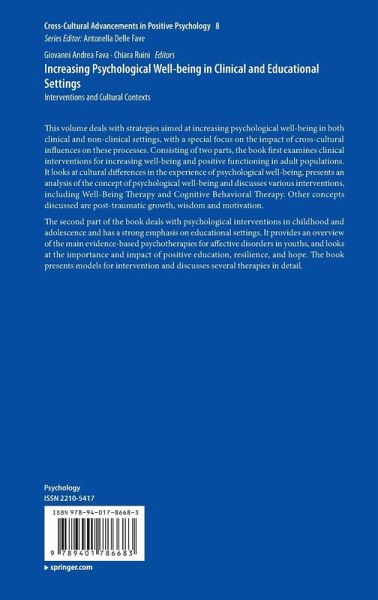 Foreword.- Chapter 1. Culture and the Promotion of Well-Being in East and West; Carol D. Ryff, Gayle D. Love and Yuri Miyamoto.- Chapter 2. The Individualized and Cross-Cultural Roots of Well-Being Therapy; Chiara Ruini and Giovanni A. Fava.- Chapter 3. The Place of Psychological Well-Being in Cognitive Therapy; Andrew K. MacLeod and Olga Luzon.- Chapter 4. Posttraumatic Growth: Challenges from a Cross-Cultural Viewpoint; Carmelo Vázquez, Pau Pérez-Sales and Christian Ochoa.- Chapter 5. Promoting Resilience and Well-Being with Wisdom and Wisdom Therapy; Michael Linden.- Chapter 6. Increasing Psychological Well-Being through Hypnosis; Tharina Guse.- Chaper 7. The Role of Motivation in Cognitive Behavioural Psychotherapy for Anxiety Disorders; Elizeth Heldt, Carolina Blaya and Gisele Gus Manfro.- Chapter 8. The Role of Psychological Well-Being in Childhood Interventions; Elisa Albieri and Dalila Visani.- Chapter 9. Well-Being and Resilience in School Settings; Toni Noble and Helen McGrath.- Chapter 10. Strength Based Resilience: Integrating Risk and Resources towards Holistic Well-Being; Tayyab Rashid, Afroze Anjum, Suzanna Stevanovski, Ron Chu, Anosha Zanjani and Alexandra Love.- Chapter 11. School Programs for Prevention of Mental Health Problems and the Promotion of Psychological Well-Being in Children; Dalila Visani, Elisa Albieri and Chiara Ruini.- Chapter 12. The Promotion of Hope in Children and Youth; Susana C. Marques and Shane J. Lopez.- Chapter 13. Life Satisfactionin Youth; Carmel Proctor and P. Alex Linley.
