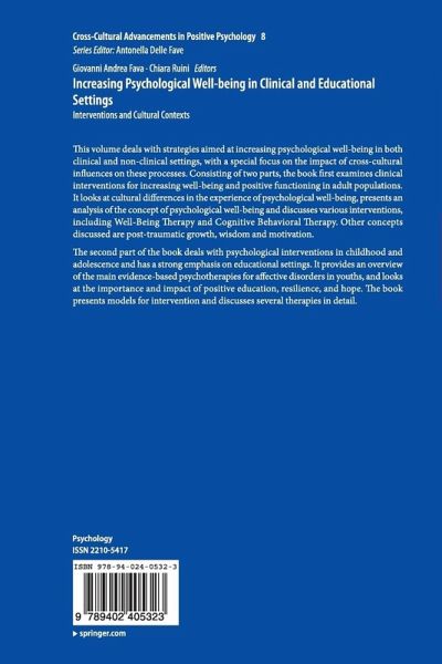 Foreword.- Chapter 1. Culture and the Promotion of Well-Being in East and West; Carol D. Ryff, Gayle D. Love and Yuri Miyamoto.- Chapter 2. The Individualized and Cross-Cultural Roots of Well-Being Therapy; Chiara Ruini and Giovanni A. Fava.- Chapter 3. The Place of Psychological Well-Being in Cognitive Therapy; Andrew K. MacLeod and Olga Luzon.- Chapter 4. Posttraumatic Growth: Challenges from a Cross-Cultural Viewpoint; Carmelo Vázquez, Pau Pérez-Sales and Christian Ochoa.- Chapter 5. Promoting Resilience and Well-Being with Wisdom and Wisdom Therapy; Michael Linden.- Chapter 6. Increasing Psychological Well-Being through Hypnosis; Tharina Guse.- Chaper 7. The Role of Motivation in Cognitive Behavioural Psychotherapy for Anxiety Disorders; Elizeth Heldt, Carolina Blaya and Gisele Gus Manfro.- Chapter 8. The Role of Psychological Well-Being in Childhood Interventions; Elisa Albieri and Dalila Visani.- Chapter 9. Well-Being and Resilience in School Settings; Toni Noble and Helen McGrath.- Chapter 10. Strength Based Resilience: Integrating Risk and Resources towards Holistic Well-Being; Tayyab Rashid, Afroze Anjum, Suzanna Stevanovski, Ron Chu, Anosha Zanjani and Alexandra Love.- Chapter 11. School Programs for Prevention of Mental Health Problems and the Promotion of Psychological Well-Being in Children; Dalila Visani, Elisa Albieri and Chiara Ruini.- Chapter 12. The Promotion of Hope in Children and Youth; Susana C. Marques and Shane J. Lopez.- Chapter 13. Life Satisfactionin Youth; Carmel Proctor and P. Alex Linley.