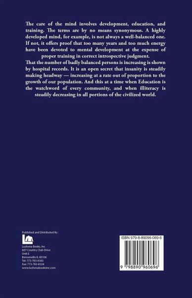 The care of the mind involves development, education, and training. The terms are by no means synonymous. A highly developed mind, for example, is not always a well-balanced one. If not, it offers proof that too many years and too much energy have been devoted to mental develop ment at the expense of proper training in correct introspective judgment. That the number of badly balanced persons is increasing is shown by hospital records. It is an open secret that insanity is steadily making head way - increasing at a rate out of proportion to the growth of our population. And this at a time when Education is the watchword of every com munity, and when illiteracy is steadily decreasing in all portions of the civilized world.