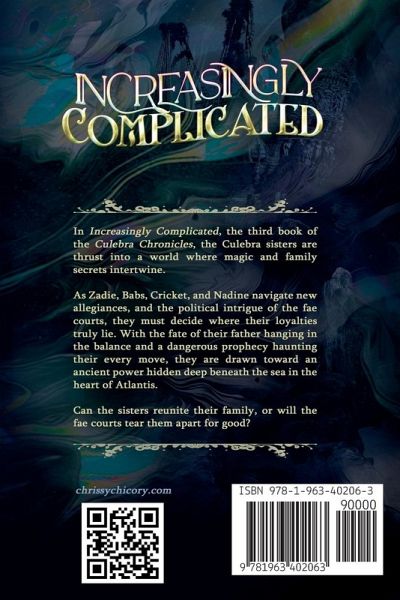 In Increasingly Complicated, the third book of the Culebra Chronicles, the Culebra sisters are thrust into a world where magic and family secrets intertwine. As Zadie, Babs, Cricket, and Nadine navigate new allegiances, and the political intrigue of the fae courts, they must decide where their loyalties truly lie. With the fate of their father hanging in the balance and a dangerous prophecy haunting their every move, they are drawn toward an ancient power hidden deep beneath the sea in the heart of Atlantis. Can the sisters reunite their family, or will the fae courts tear them apart for good?
