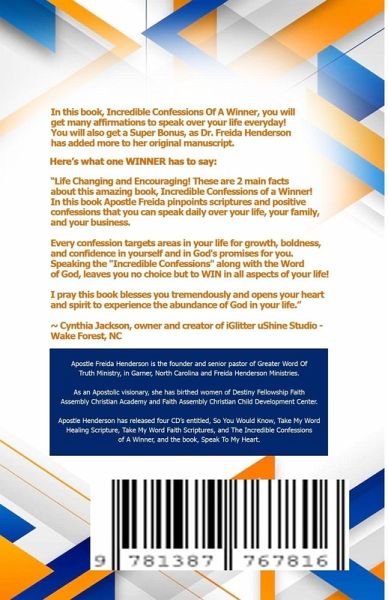 This is what I gave for the back: In this book, Incredible Confessions Of A Winner, you will get many affirmations to speak over your life everyday! You will also get a Super Bonus, as Dr. Freida Henderson has added more to her original manuscript. Here's what one WINNER has to say: "Life Changing and Encouraging! These are 2 main facts about this amazing book, Incredible Confessions of a Winner! In this book Apostle Freida pinpoints scriptures and positive confessions that you can speak daily over your life, your family, and your business. Every confession targets areas in your life for growth, boldness, and confidence in yourself and in God's promises for you. Speaking the "Incredible Confessions" along with the Word of God, leaves you no choice but to WIN in all aspects of your life! I pray this book blesses you tremendously and opens your heart and spirit to experience the abundance of God in your life." ~ Cynthia Jackson, owner and creator of iGlitter uShine Studio - Wake Forest, NC Apostle Freida Henderson is the founder and senior pastor of Greater Word Of Truth Ministry, in Garner, North Carolina and Freida Henderson Ministries. As an Apostolic visionary, she has birthed women of Destiny Fellowship Faith Assembly Christian Academy and Faith Assembly Christian Child Development Center. Apostle Henderson has released four CD's entitled, So You Would Know, Take My Word Healing Scripture, Take My Word Faith Scriptures, and The Incredible Confessions of A Winner, and the book, Speak To My Heart. She was recognized at the 2013's TCP Magazine 9th Anniversary, You Don't Know My Story, 2013's Overcoming Women. Apostle Henderson has dedicated her life to Winning Souls and saving lives for Jesuse Christ!