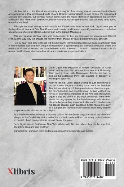 Identical twins ... the idea alone stirs unique thoughts of something special because identical twins are exceptional in this complicated world of ours. Originally designated to be one person, the original cell split and two separate, but identical human beings were the result. Identical in appearance, but are they identical in their mind, heart and soul? Certainly nature vs. nurturing comes into play, but really, deep down, how alike are they? Although the initial setting for this story is the Catskill Mountains in New York, Ligotti takes you to the big cities of New York City, New Orleans and Houston and then on to an Afghanistan war zone before returning you where it all started, a horse farm in the Catskill Mountains. This story is about identical twins who part company in their late teens and live separate and different lives. Will the way they live change the way they think and act or was it predetermined by genetics? How far apart from their 'oneness' will they be taken? Incredible Deception will guide you through each of their separate lives and then bring them together in a spell binding and dramatic conclusion where one twin forces himself to return to the home he hated and to a woman ... his wife ... that he doesn't know. It's a must read for those who love a love story and readers of suspense thrillers.