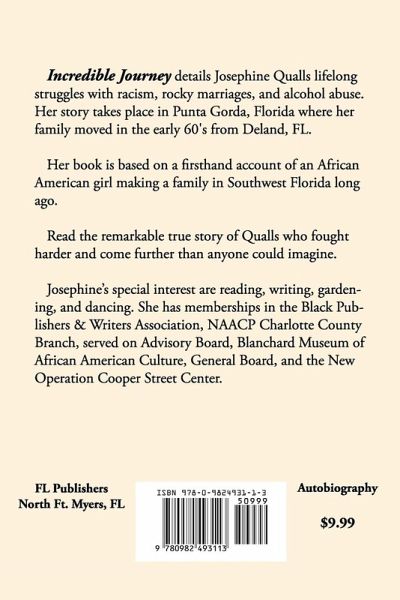 Incredible Journey details Josephine Qualls lifelong struggles with racism, rocky marriages, and alcohol abuse. The setting takes place in Punta Gorda, Florida where her family moved in the early 60's from Deland FL. Her book is based on a firsthand account of an African - American girl making a family in Southwest Florida long ago. Read the remarkable true story of Qualls who fought harder and come further than anyone could imagine. Her special interest are reading, writing, gardening and dancing. Membership in the Black Publishers & Writers Association, NAACP Charlotte County Branch, served on Advisory Board, Blanchard Museum of African American Culture, General Board, and New Operation Cooper Street Center.